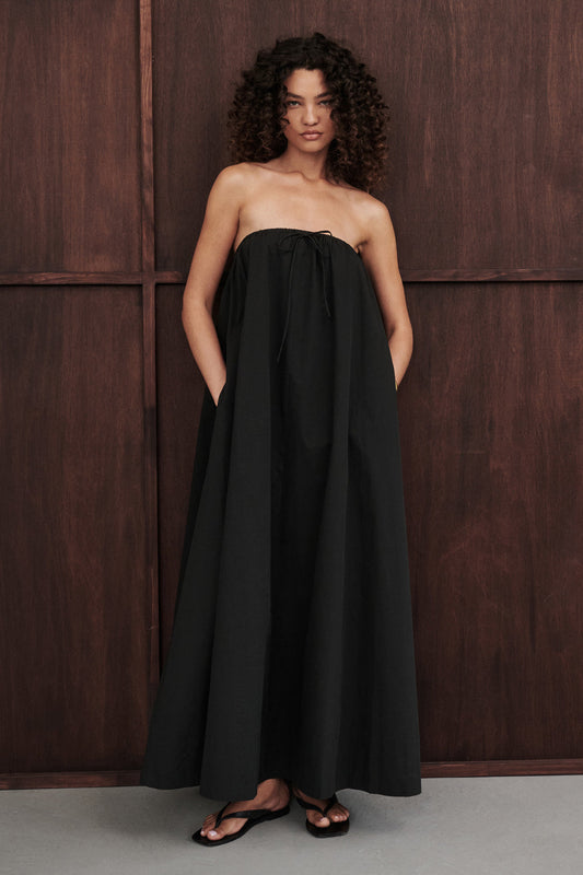 SOMMER BLACK STRAPLESS POPLIN MIDI DRESS
