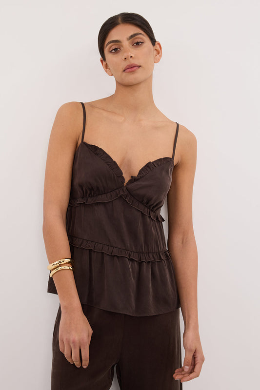 LENA BITTER CHOC SILK SLEEVELESS FRILL TOP