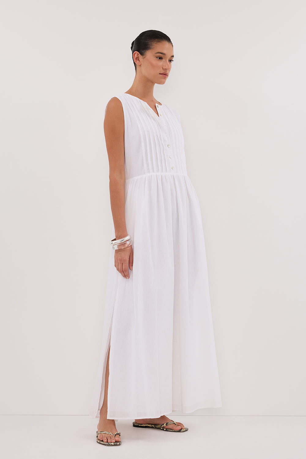 LARS WHITE PINTUCK LINEN MIDI DRESS